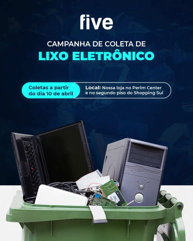 Tem lixo eletrônico em casa e não sabe como descartá-lo? A Five realiza, desde a última segunda-feira (10), uma campanha para descarte e coleta desse material. A loja está coletando os itens da linha verde e marrom, que serão enviados para uma empresa terceirizada que efetuará a reciclagem e descarte correto.