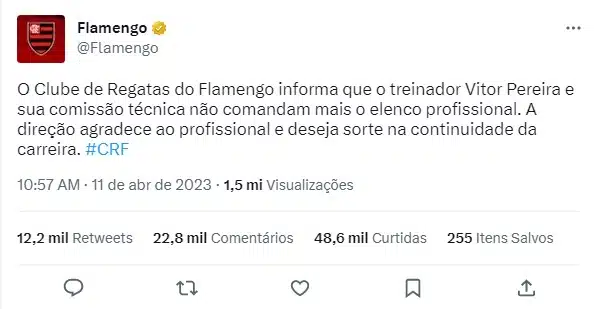 O Flamengo anunciou nesta terça-feira (11), que Vítor Pereira não é mais técnico da equipe. O treinador não resistiu à derrota para o Fluminense por 4 a 1, no último domingo (9), no segundo jogo da final do Campeonato Carioca, e foi demitido do cargo.