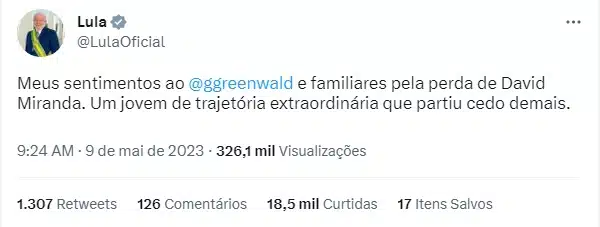 O presidente da República, Luiz Inácio Lula da Silva, fez uma publicação no Twitter, sobre a morte do ex-deputado federal David Miranda