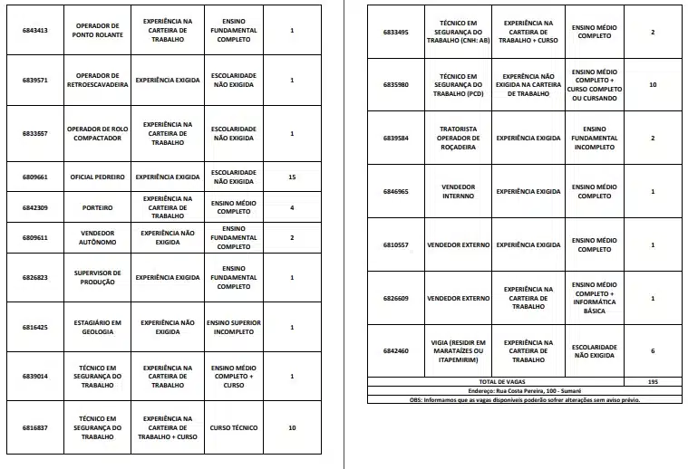 As oportunidades de emprego são para diversos cargos e níveis de escolaridade e para cidades do Sul do ES. No entanto, é preciso fazer um cadastro no Sine Cachoeiro para concorrê-las.
