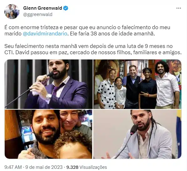 Receba as principais notícias no seu WhatsApp! clique aqui“É com a mais profunda tristeza que comunico o falecimento do meu esposo, David Miranda. Ele faria 38 anos amanhã. Sua morte, esta manhã, ocorreu após uma batalha de 9 meses na UTI. Ele morreu em plena paz, cercado por nossos filhos, familiares e amigos”, escreveu Glenn, no Twitter.
