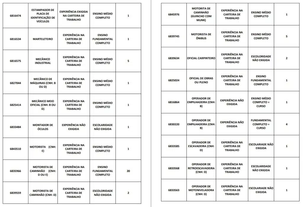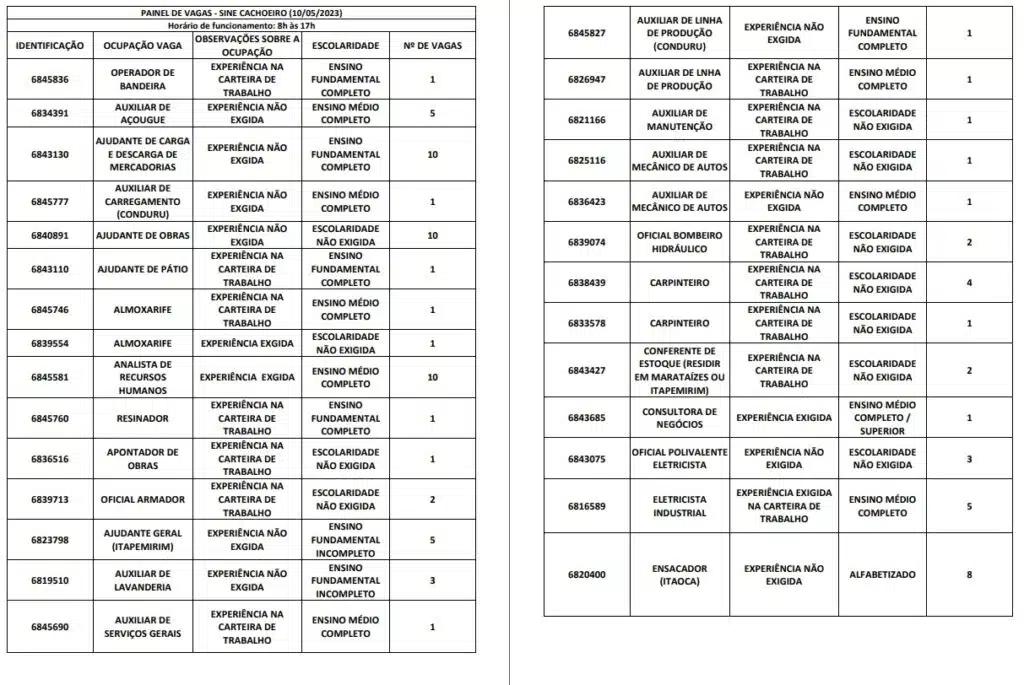 Receba as principais notícias no seu WhatsApp! clique aquiAs oportunidades de emprego são para diversos cargos e níveis de escolaridade e para cidades do Sul do ES. No entanto, é preciso fazer um cadastro no Sine Cachoeiro para concorrê-las.