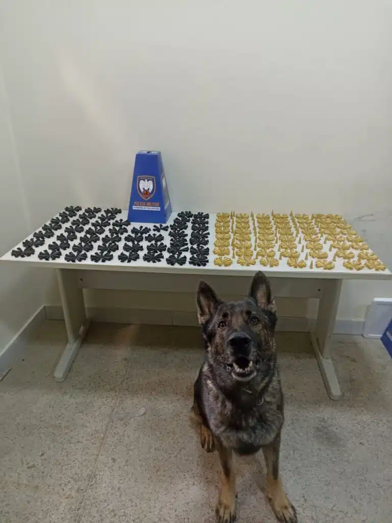 Já no bairro Camurugi, nas adjacências do Condomínio Viver um Sonho Lindo, foram apreendidos 1.087 pinos de cocaína e material para embalo de entorpecentes.