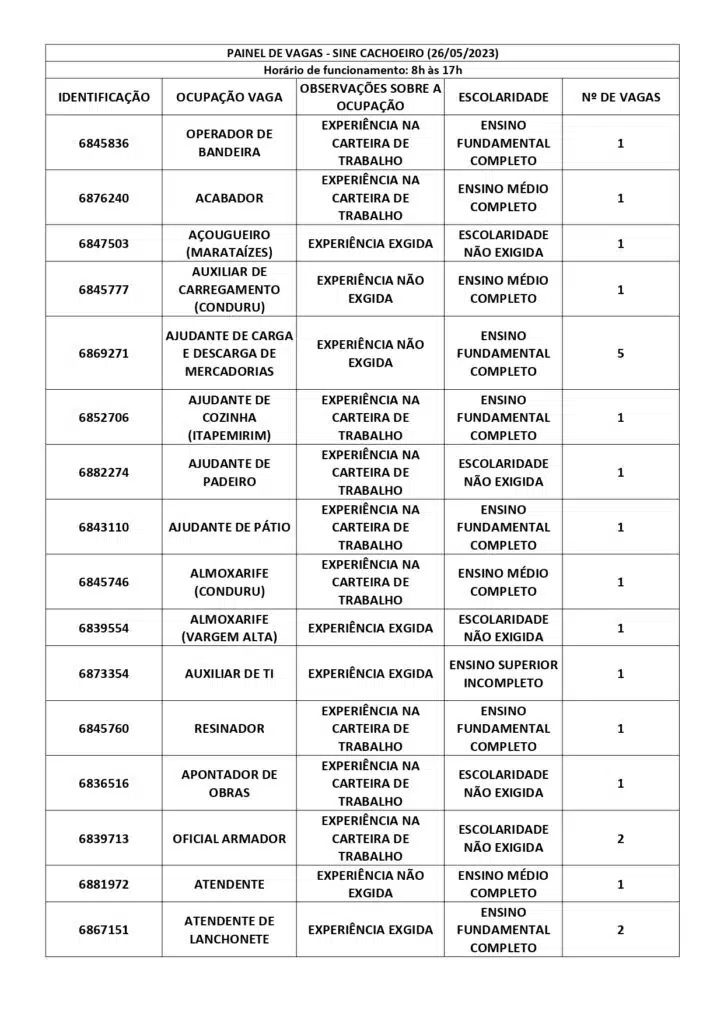 Receba as principais notícias no seu WhatsApp! clique aquiAs oportunidades de emprego são para diversos cargos e níveis de escolaridade e para cidades do Sul do ES. No entanto, é preciso fazer um cadastro no Sine Cachoeiro para concorrê-las.