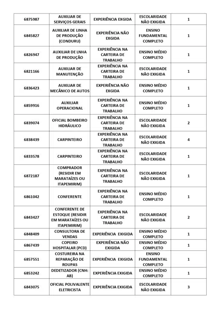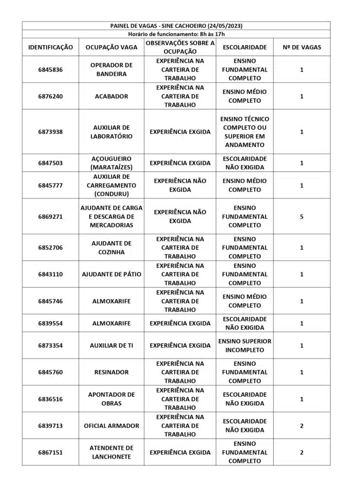 Receba as principais notícias no seu WhatsApp! clique aquiAs oportunidades de emprego são para diversos cargos e níveis de escolaridade e para cidades do Sul do ES. No entanto, é preciso fazer um cadastro no Sine Cachoeiro para concorrê-las.