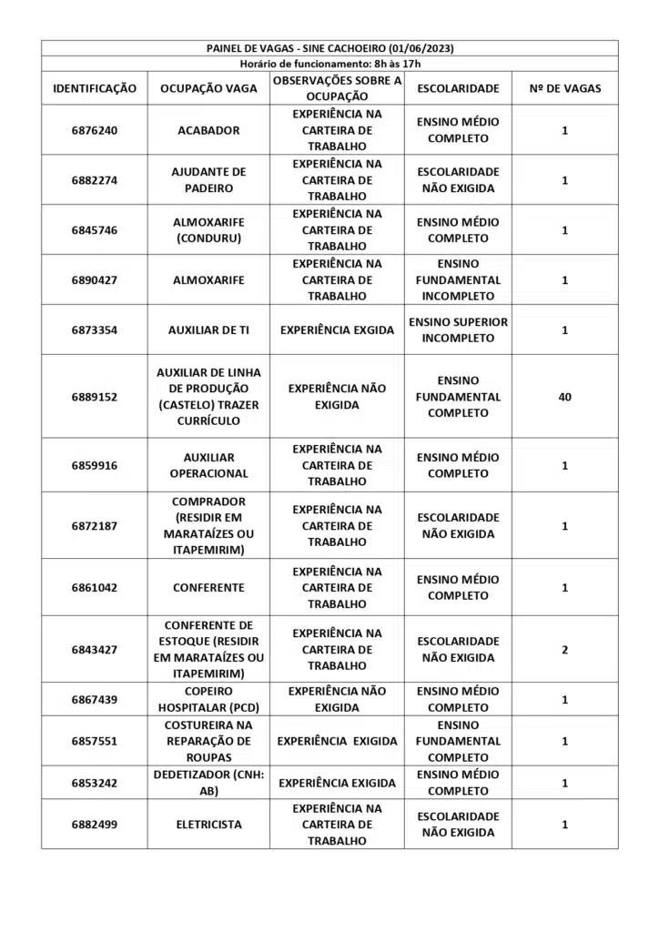Receba as principais notícias no seu WhatsApp! clique aquiAs oportunidades de emprego são para diversos cargos e níveis de escolaridade e para cidades do Sul do ES. No entanto, é preciso fazer um cadastro no Sine Cachoeiro para concorrê-las.