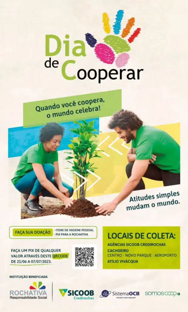 O Sicoob Credirochas vai realizar o Dia de Cooperar para arrecadar itens de higiene pessoal, que serão doados para a Rochativa. Neste ano, o tema é: “Quando você coopera, o mundo celebra”.