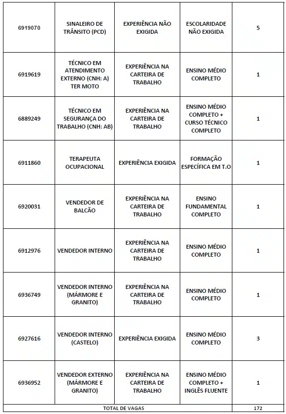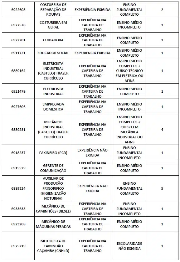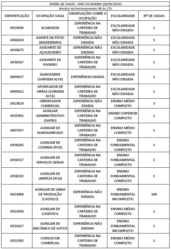 As oportunidades de emprego são para diversos cargos e níveis de escolaridade e para cidades do Sul do ES. No entanto, é preciso fazer um cadastro no Sine Cachoeiro para concorrê-las.