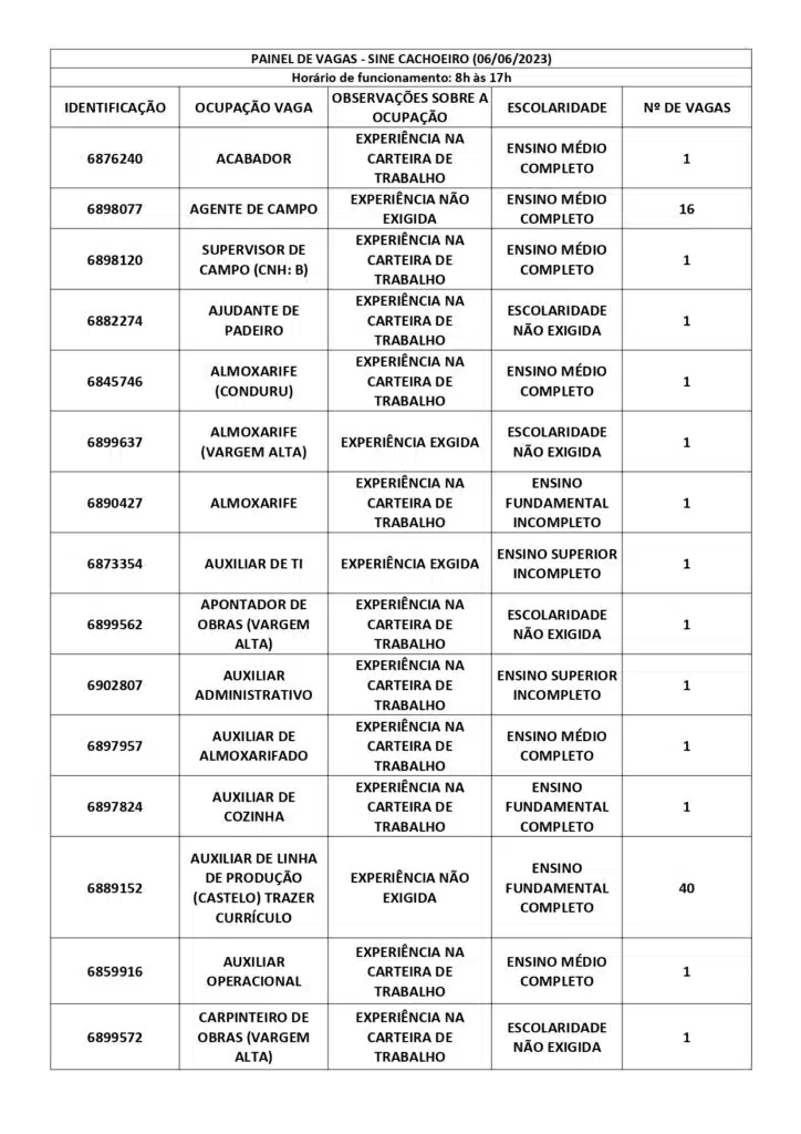 Receba as principais notícias no seu WhatsApp! clique aquiAs oportunidades de emprego são para diversos cargos e níveis de escolaridade e para cidades do Sul do ES. No entanto, é preciso fazer um cadastro no Sine Cachoeiro para concorrê-las.