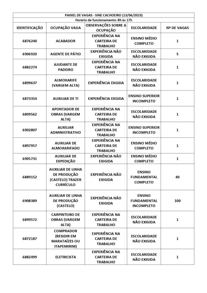 Receba as principais notícias no seu WhatsApp! clique aquiAs oportunidades de emprego são para diversos cargos e níveis de escolaridade e para cidades do Sul do ES. No entanto, é preciso fazer um cadastro no Sine Cachoeiro para concorrê-las.