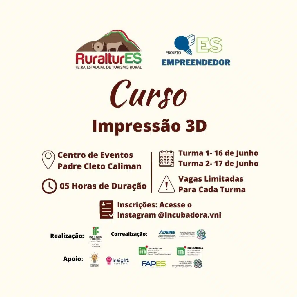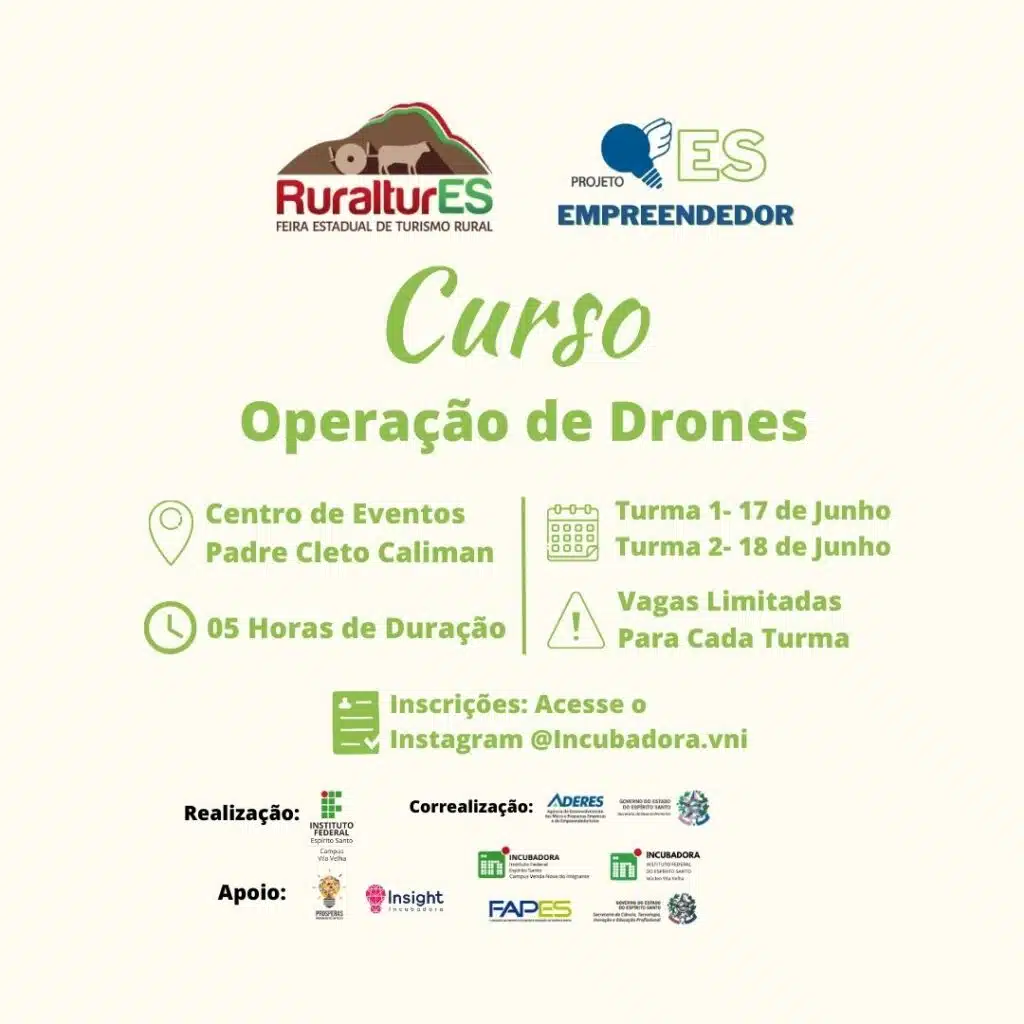 Estão abertas até o dia 11 de junho as inscrições para os cursos que serão disponibilizados durante a RuralturES deste ano. Os cursos de “Operação de Drones” e “Prototipação em Impressão 3D resina e filamento” são uma iniciativa do Ifes de Venda Nova do Imigrante, por meio do projeto ES Empreendedor, e são totalmente gratuitos. Confira abaixo as especificações:
