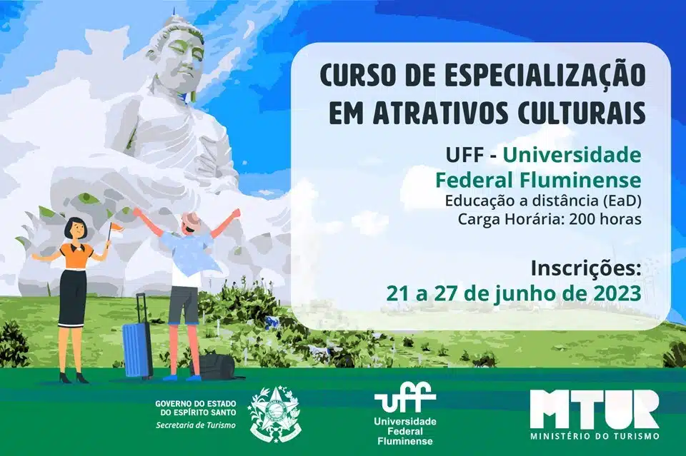 O Ministério do Turismo (MTur), em parceria com a Universidade Federal Fluminense (UFF), está com inscrições abertas até a próxima terça-feira (27), para o curso de “Especialização Técnica em Atrativos Culturais” destinados aos Guias de Turismo habilitados no Cadastur como “Guia Regional” e habilitados para atuação em um dos quatro estados da macrorregião Sudeste: Espírito Santo, Minas Gerais, Rio de Janeiro e São Paulo.