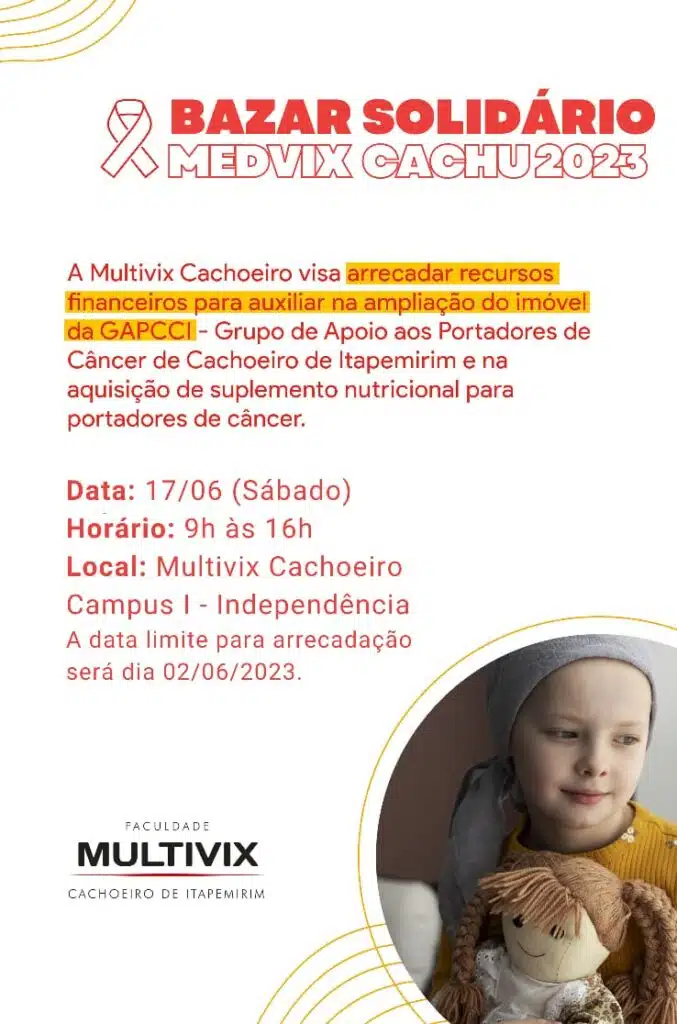 No próximo sábado (17), a Multivix Cachoeiro promove o Bazar Solidário MedVix Cachu 2023, que visa arrecadar recursos financeiros para ampliação da casa onde funciona o Grupo de Apoio aos Portadores de Câncer de Cachoeiro de Itapemirim (GAPCCI) e também na aquisição de suplemento nutricional que são doadores aos usuários.