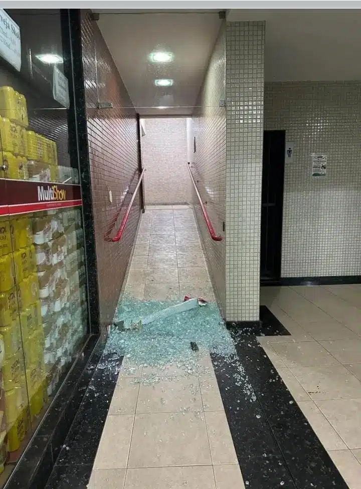 Uma pizzaria que fica no andar de cima estava arrombada e havia bastante sangue no estabelecimento, indicado que o autor havia se ferido, contudo nenhum responsável havia chegado. Tanto na ocorrência de domingo, como na segunda-feira, o suspeito fugiu de bicicleta.