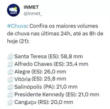 O Instituto Nacional de Meteorologia (Inmet) divulgou as sete cidades do Brasil com maiores volumes de chuva nas últimas 24 horas. Desse total, cinco são no Espírito Santo e duas são do Sul do Estado.