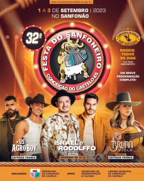 A Prefeitura de Conceição do Castelo divulgou as atrações nacionais da 32ª Festa do Sanfoneiro, que será realizada entre os dias 1 a 3 de setembro. O evento será realizado no Sanfonão e a programação completa será anunciada nos próximos dias.