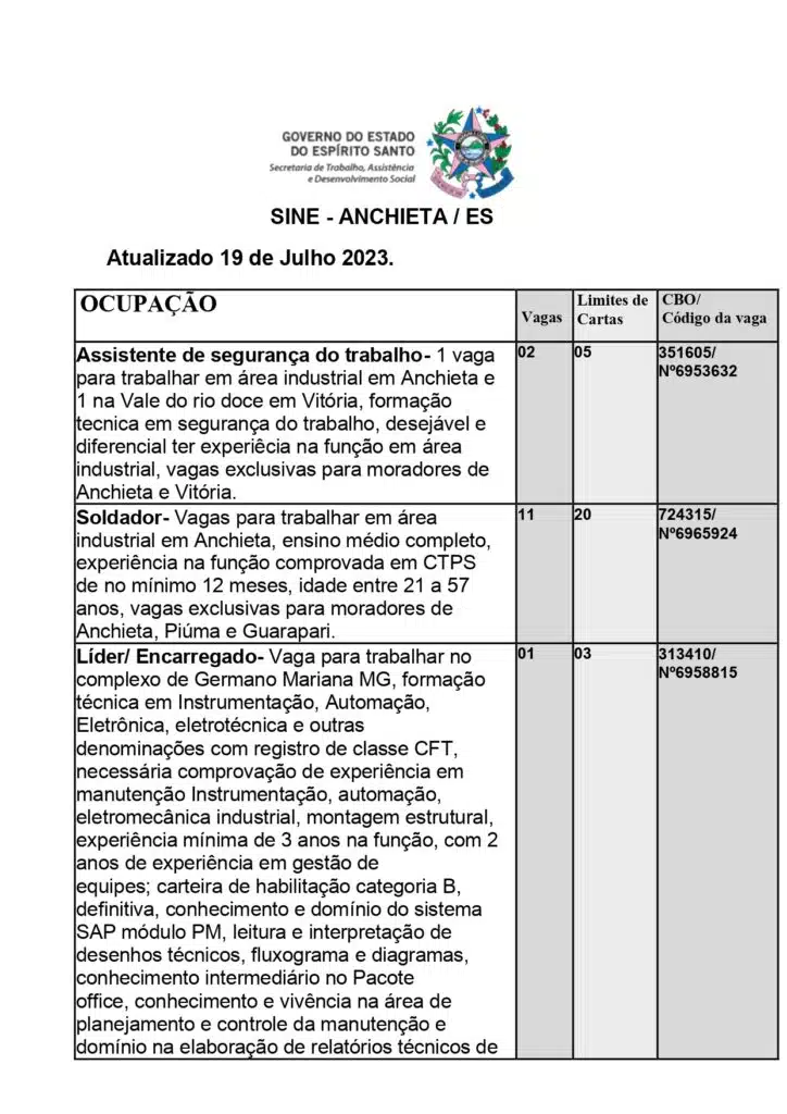 Ainda segundo o Sine Anchieta, as vagas de empregos poderão sofrer alteração sem aviso prévio. Além disso, para cada oportunidade, há um limite de encaminhamento especificado pela empresa.