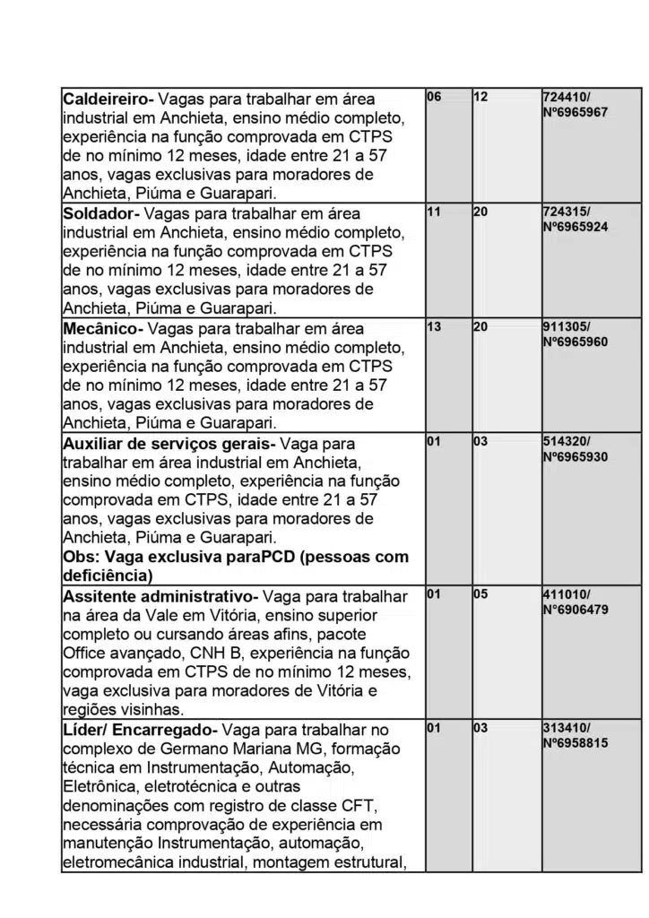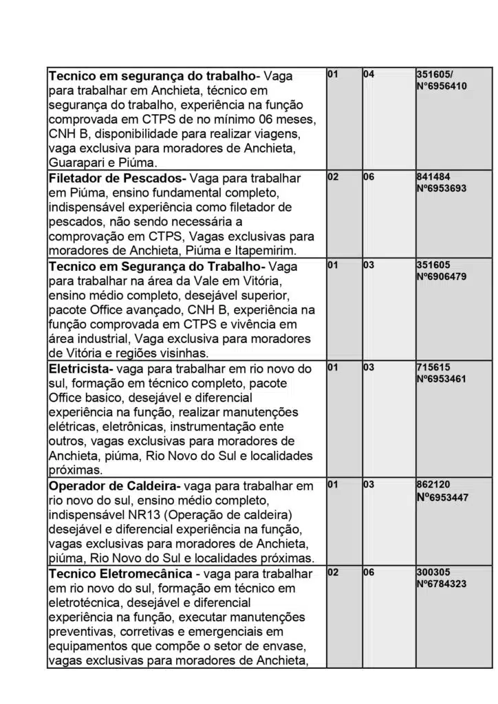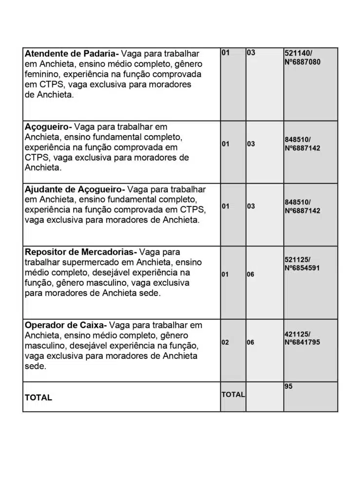 Ainda segundo o Sine Anchieta, as vagas de empregos poderão sofrer alteração sem aviso prévio. Além disso, para cada oportunidade, há um limite de encaminhamento especificado pela empresa.