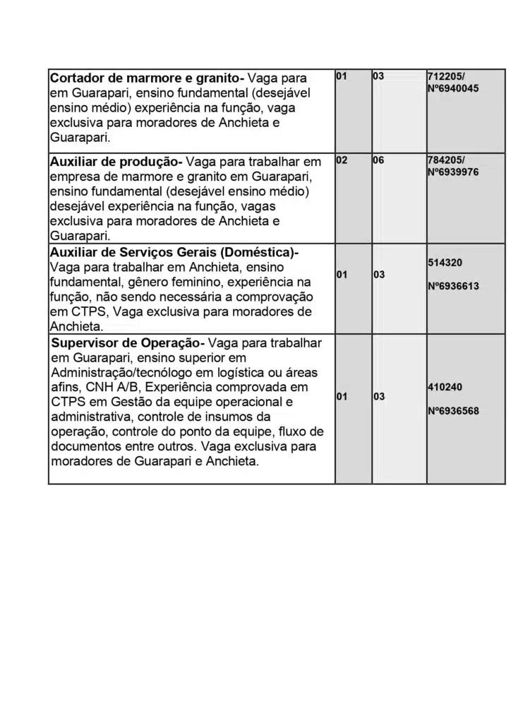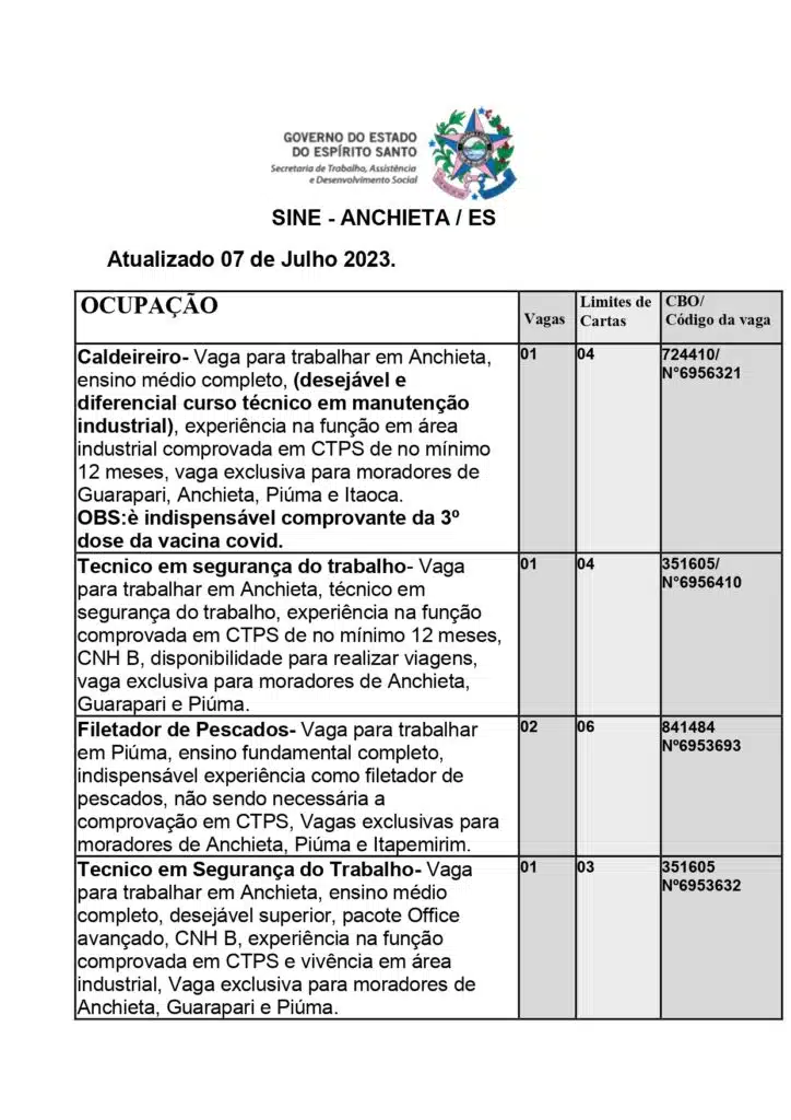 Ainda segundo o Sine Anchieta, as vagas de empregos poderão sofrer alteração sem aviso prévio. Além disso, para cada oportunidade, há um limite de encaminhamento especificado pela empresa.