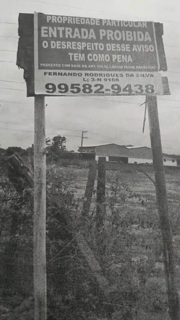Essas são as placas que eram colocadas nas propriedades depois que eram invadidas. O grupo criminoso agia de forma rigorosa, ao chegarem aos locais, sempre com muitos veículos e até mesmo armados, colocavam placas que sugeriam que o terreno havia sido tomado e portanto, tinham proprietários.