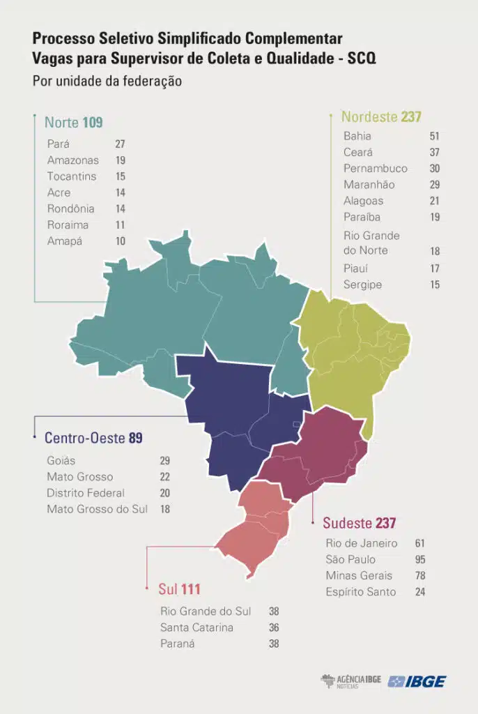 Nesta terça-feira (4), o IBGE abriu inscrições para dois processos seletivos para Agentes de Pesquisas e Mapeamentos (APM) e Supervisor de Coleta e Qualidade (SCQ) em 26 estados de todo país. São oferecidas 7.548 vagas, ao total, sendo 6.742 para APM, que exige o nível médio completo, e 806 para SCQ, que, além do ensino médio completo, requer Carteira Nacional de Habilitação (CNH) no mínimo categoria B. Há reserva de vagas para pessoas pretas e pardas e pessoas com deficiência.