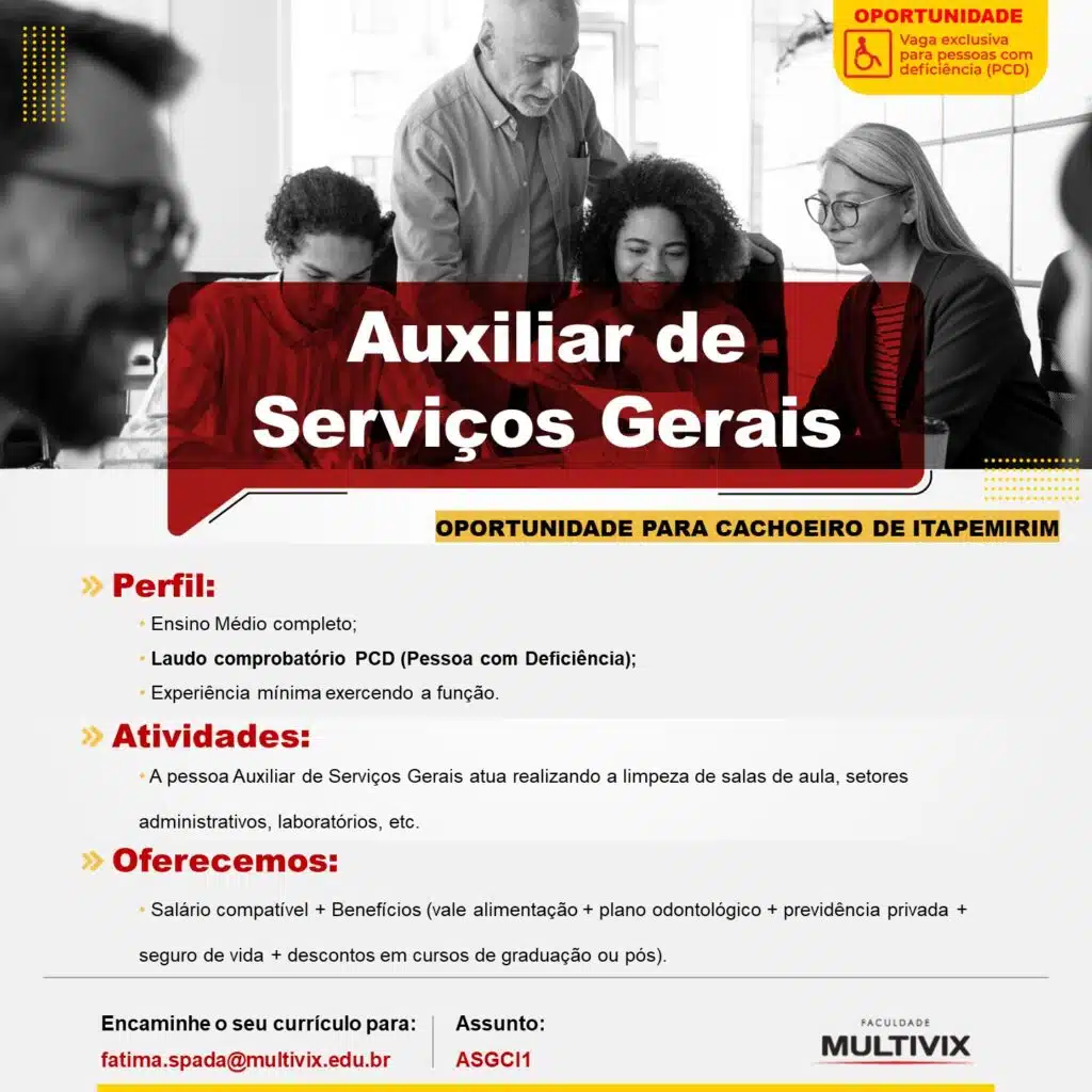 A Multivix Cachoeiro de Itapemirim está com duas vagas de trabalho abertas, exclusivas para pessoas com deficiência (PCD): de auxiliar de serviços gerais e auxiliar de portaria.