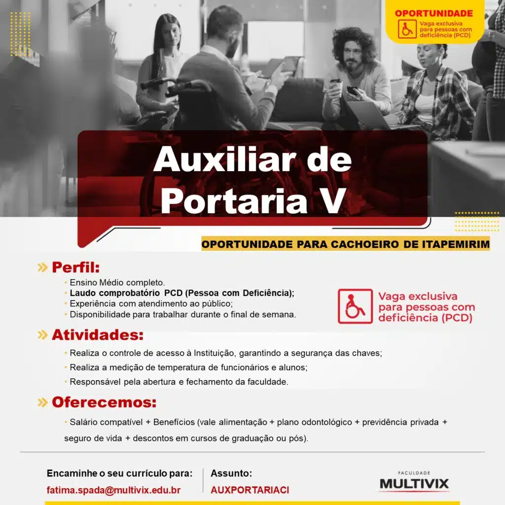 Já a função de auxiliar de portaria tem como requisito: ensino médio completo, laudo comprobatório PCD, experiência em atendimento ao público e disponibilidade para trabalhar no fim de semana.