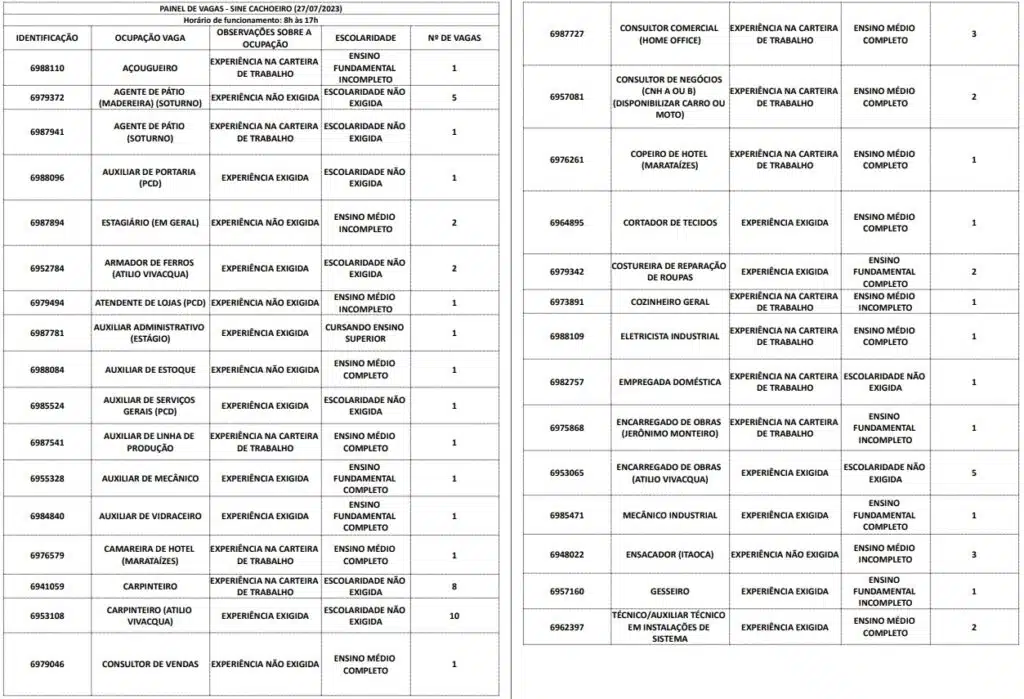 As oportunidades de emprego são para diversos cargos e níveis de escolaridade e para cidades do Sul do ES. No entanto, é preciso fazer um cadastro no Sine Cachoeiro para concorrê-las.