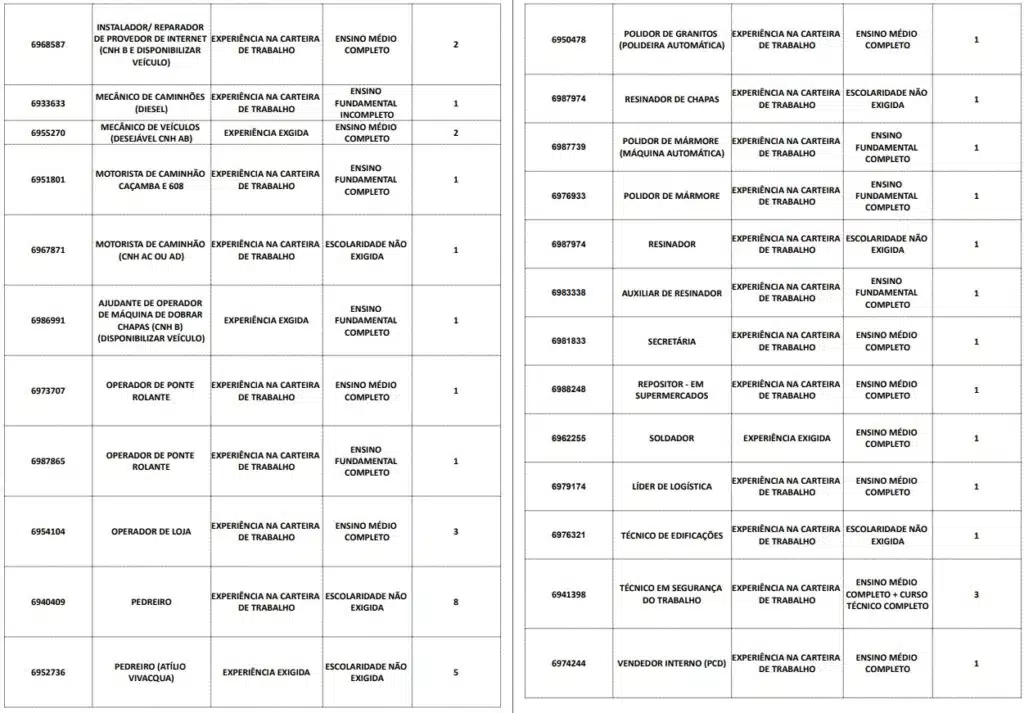 Receba as principais notícias no seu WhatsApp! clique aquiAs oportunidades de emprego são para diversos cargos e níveis de escolaridade e para cidades do Sul do ES. No entanto, é preciso fazer um cadastro no Sine Cachoeiro para concorrê-las.