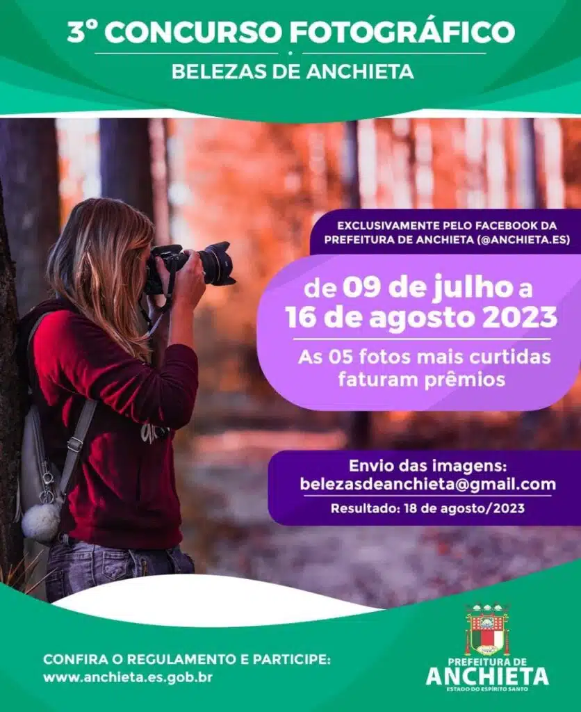 A Prefeitura de Anchieta, por meio Gerência de Comunicação Social, promove até 16 de agosto o 3º Concurso fotográfico ‘Belezas de Anchieta. A competição irá acontecer exclusivamente pelo perfil da prefeitura no Facebook (@anchieta.es). As cinco fotos mais curtidas irão faturar diária em pousada com acompanhante e pratos exclusivos da culinária do município.