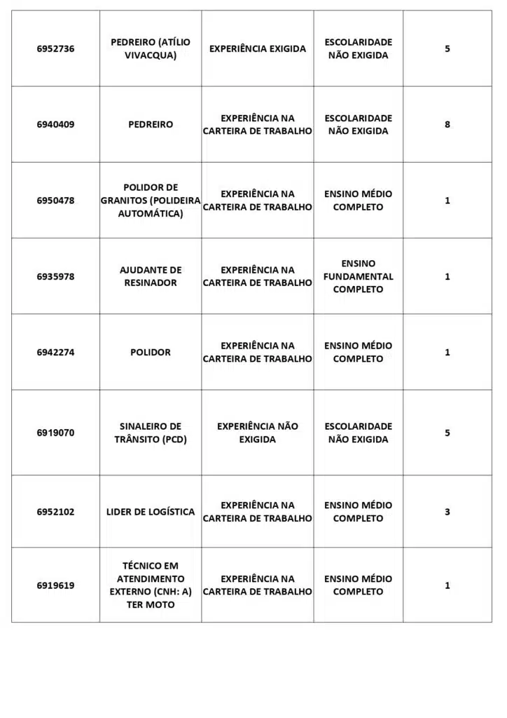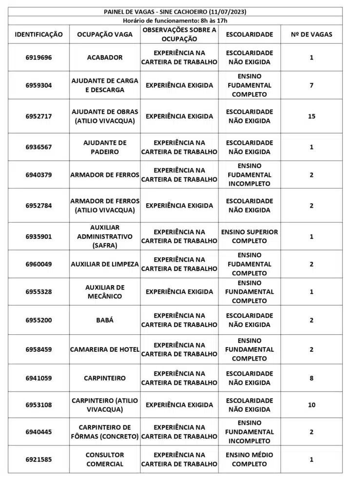 Receba as principais notícias no seu WhatsApp! clique aquiAs oportunidades de emprego são para diversos cargos e níveis de escolaridade e para cidades do Sul do ES. No entanto, é preciso fazer um cadastro no Sine Cachoeiro para concorrê-las.