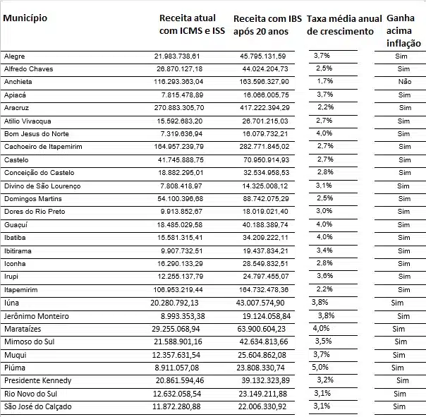 Uma simulação feita pela Confederação Nacional dos Municípios (CMN) aponta qual será o impacto do substitutivo da reforma tributária, considerando a transição de 20 anos, por município. Confira como ficará a arrecadação nas cidades do Sul do Espírito Santo.