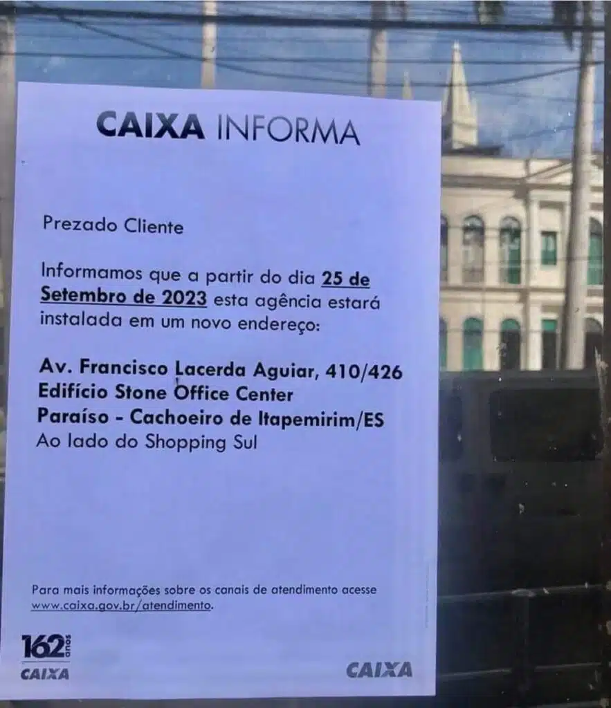 Os clientes da Caixa Econômica Federal em Cachoeiro de Itapemirim estão sendo pegos de surpresa com uma informação sobre mudança de endereço. Um aviso instalado na entrada da Agência 171, localizada na Praça Jerônimo Monteiro, no centro da cidade, diz que a unidade passará a funcionar em novo endereço, no Edifício Stone Office Center, bairro Paraíso (ao lado do Shopping Sul).