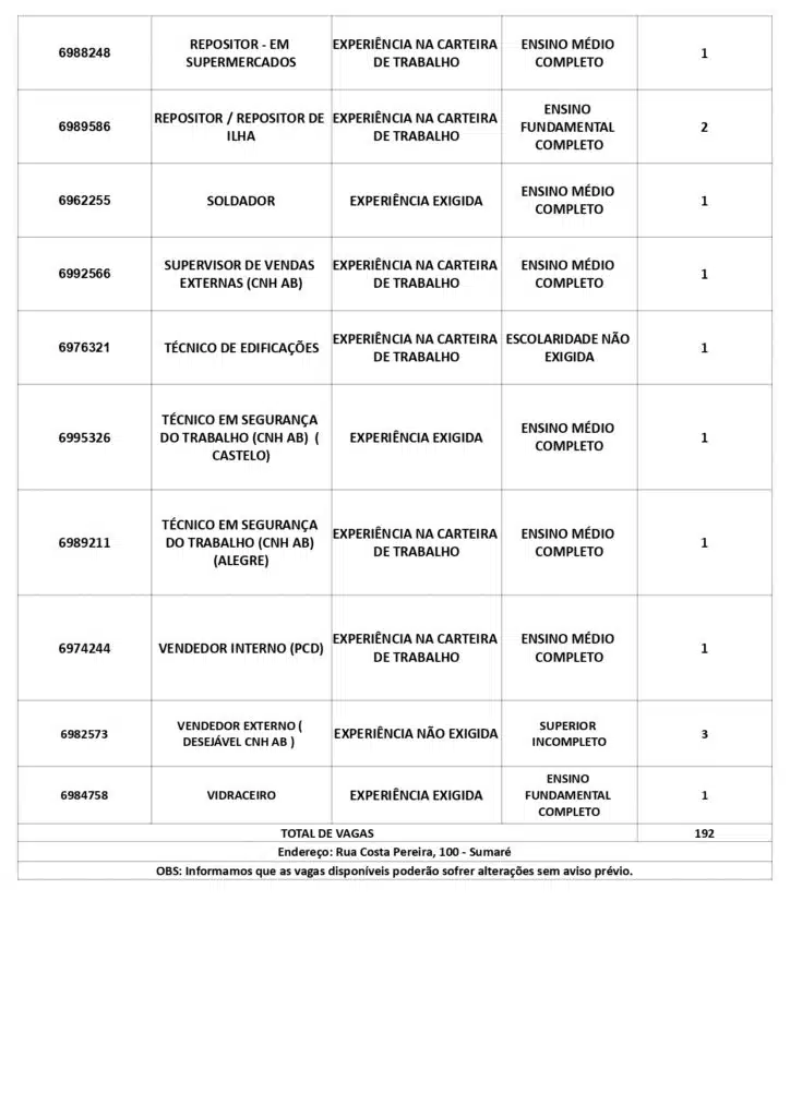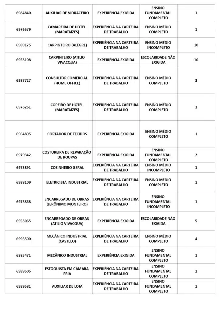 As oportunidades de emprego são para diversos cargos e níveis de escolaridade e para cidades do Sul do ES