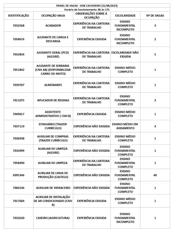 Receba as principais notícias no seu WhatsApp! clique aquiAs oportunidades de emprego são para diversos cargos e níveis de escolaridade e para cidades do Sul do ES. No entanto, é preciso fazer um cadastro no Sine Cachoeiro para concorrê-las.