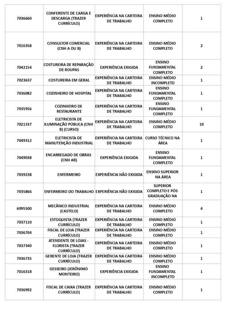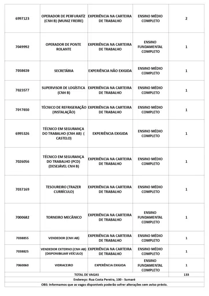 As oportunidades de emprego são para diversos cargos e níveis de escolaridade