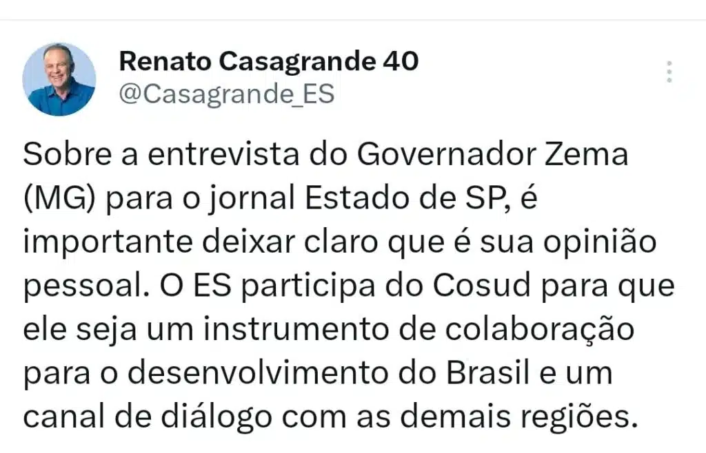“Sobre a entrevista do governador Zema (MG) para o jornal Estado de SP, é importante deixar claro que é sua opinião pessoal. O ES participa do Cosud para que ele seja um instrumento de colaboração para o desenvolvimento do Brasil e um canal de diálogo com as demais regiões”, ressaltou o chefe do Poder Executivo capixaba.
