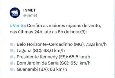 O Instituto Nacional de Meteorologia (Inmet) divulgou na manhã desta quarta-feira (9), as maiores rajadas de vento no Brasil, registradas nas últimas 24 horas.