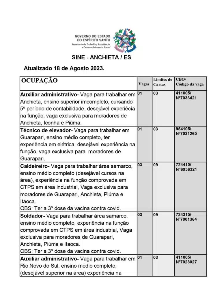 Ainda segundo o Sine Anchieta, as vagas de empregos poderão sofrer alteração sem aviso prévio. Além disso, para cada oportunidade, há um limite de encaminhamento especificado pela empresa.