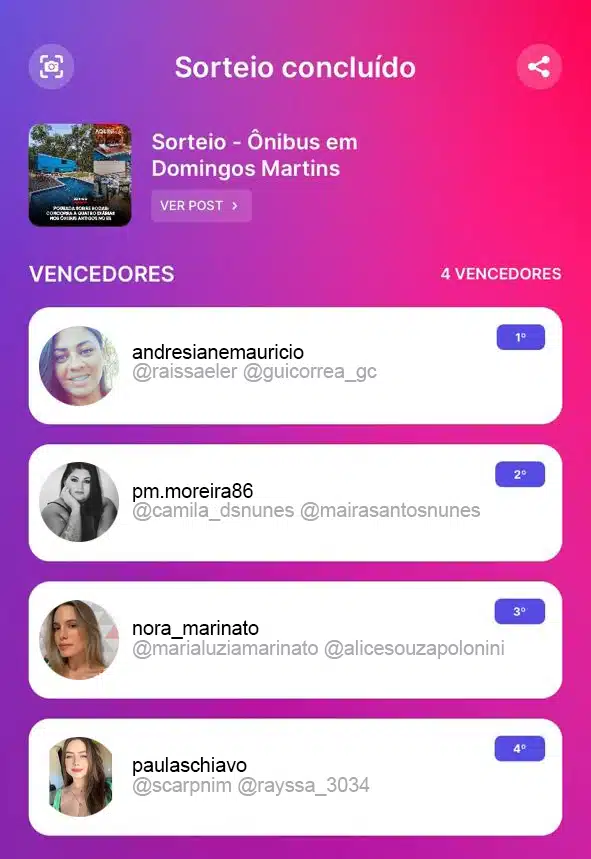 Os ganhadores dos sorteios são: @andresianemauricio, @pm.moreira86, @nora_marinato, @paulaschiavo.