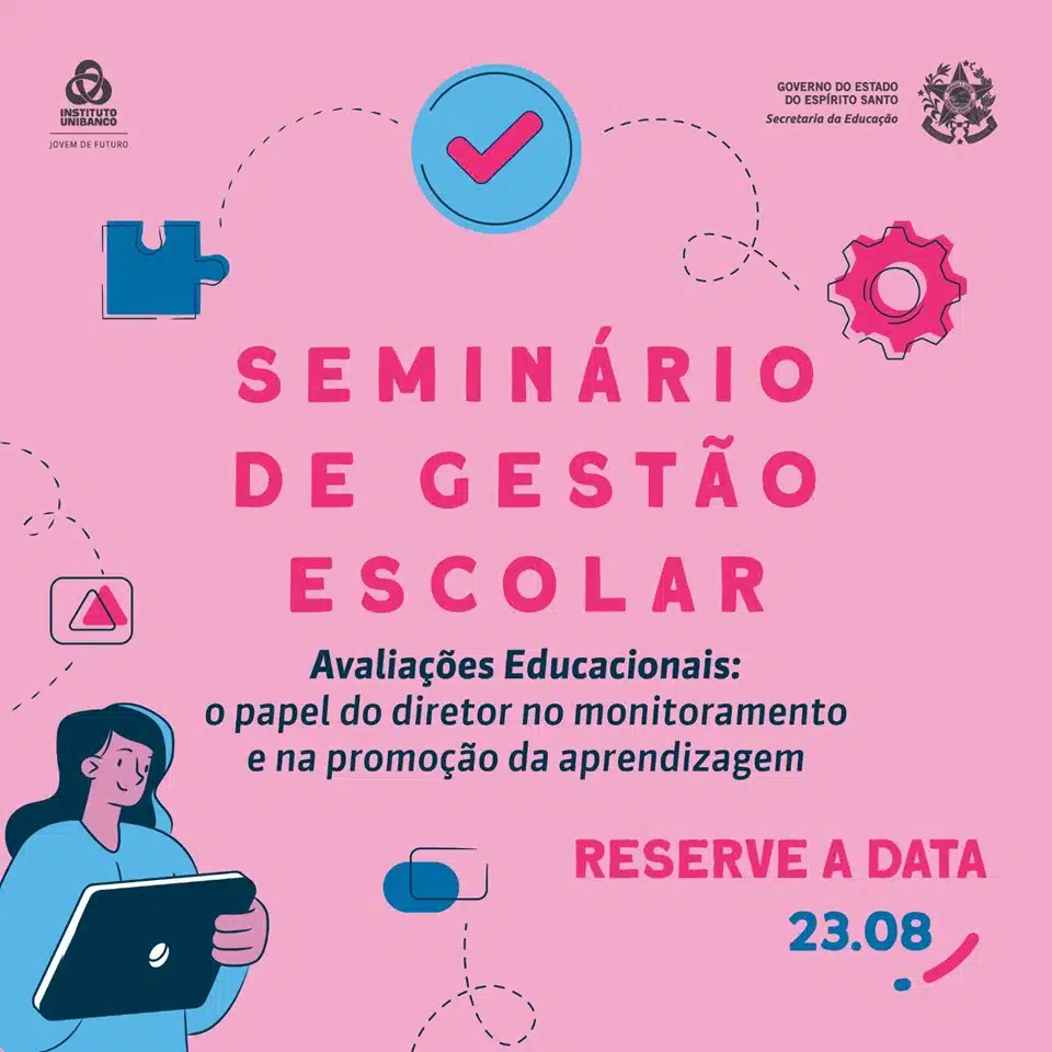 Na próxima quarta-feira (23) a Secretaria da Educação (Sedu) realizará o “Seminário de Gestão Escolar – Avaliações educacionais: o papel do diretor no monitoramento e na promoção da aprendizagem”. O evento será realizado no Centro de Convenções de Vitória, a partir das 13h30.