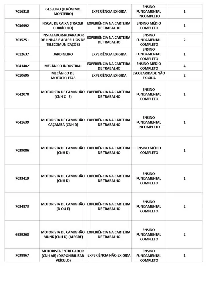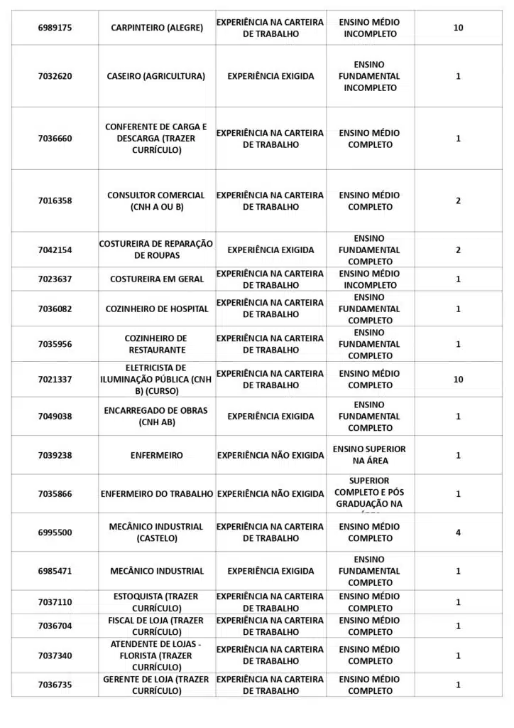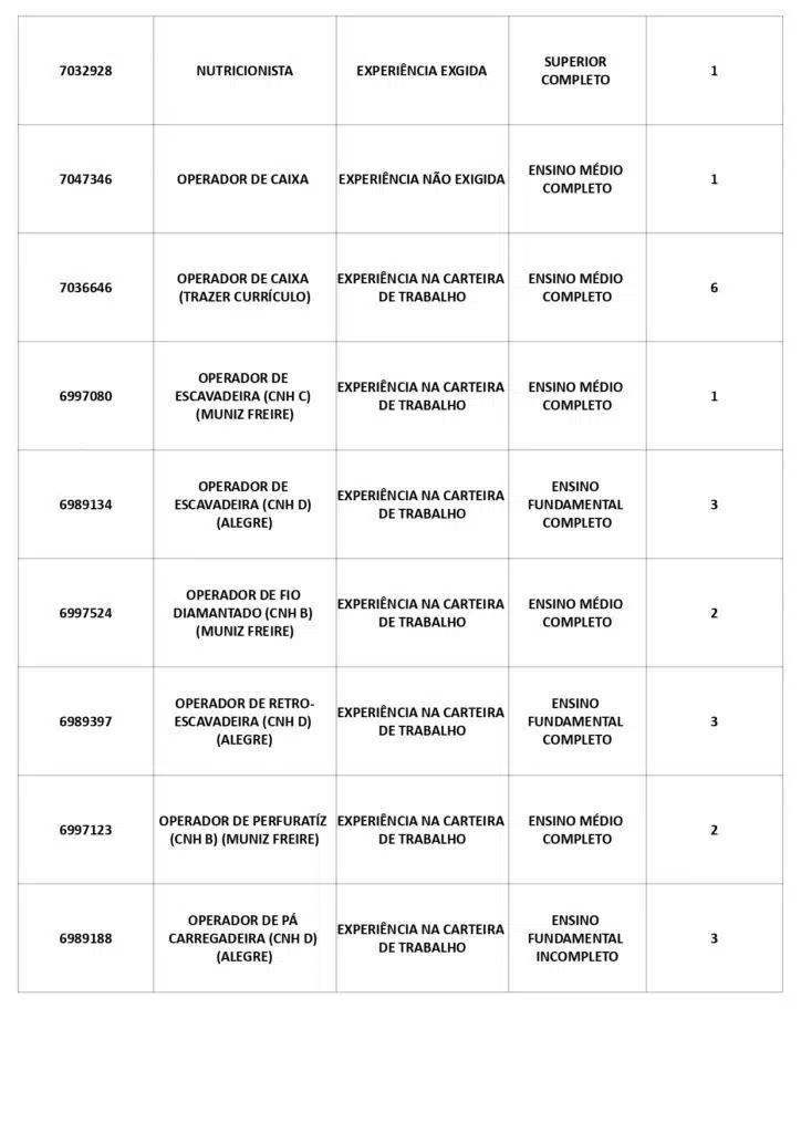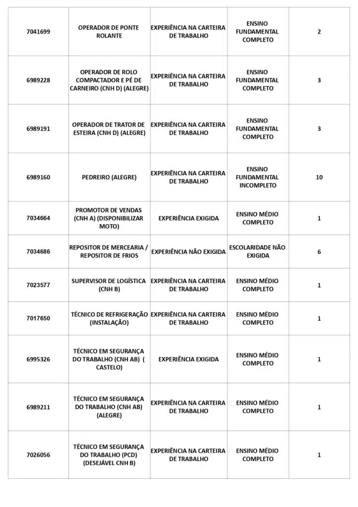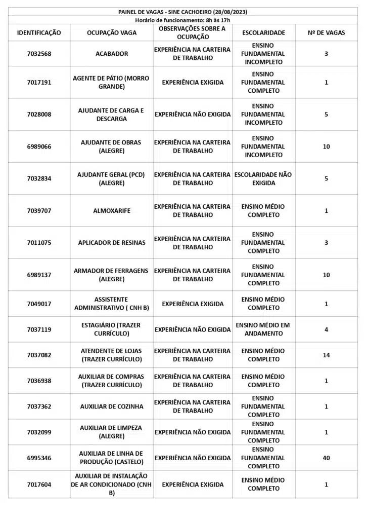 As oportunidades de emprego são para diversos cargos e níveis de escolaridade e para cidades do Sul do ES. No entanto, é preciso fazer um cadastro no Sine Cachoeiro para concorrê-las.