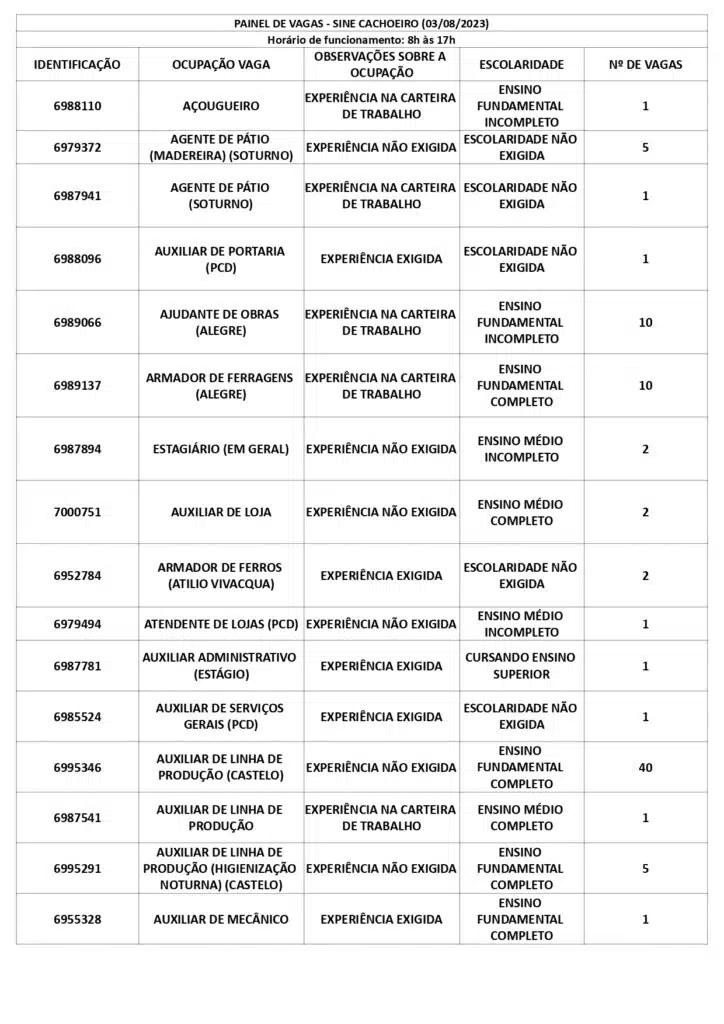 Receba as principais notícias no seu WhatsApp! clique aquiAs oportunidades de emprego são para diversos cargos e níveis de escolaridade e para cidades do Sul do ES. No entanto, é preciso fazer um cadastro no Sine Cachoeiro para concorrê-las. Quem tiver interesse pode se candidatar às vagas de emprego ainda hoje. Isso porque a Agência do Trabalhador funciona das 8h às 17h. O banco de empregos fica na rua Costa Pereira, n° 100, no bairro Sumaré. Antes da mudança, uma agência ficava na Avenida Beira Rio.