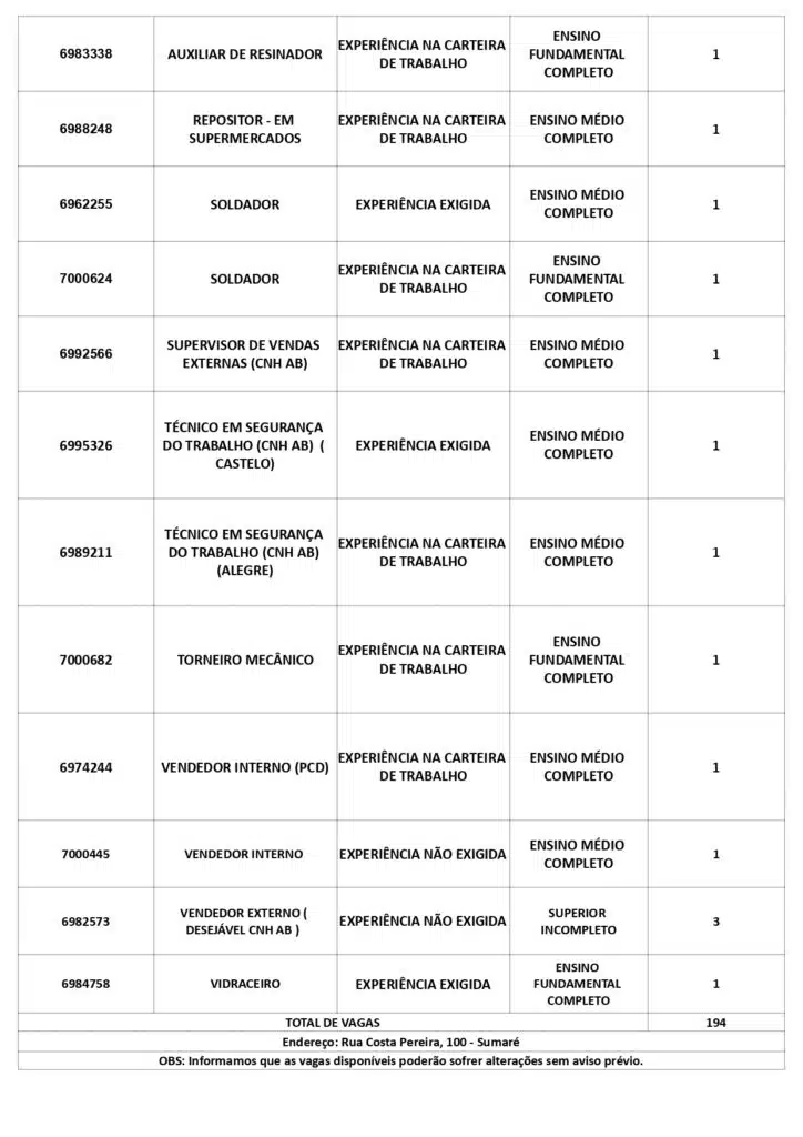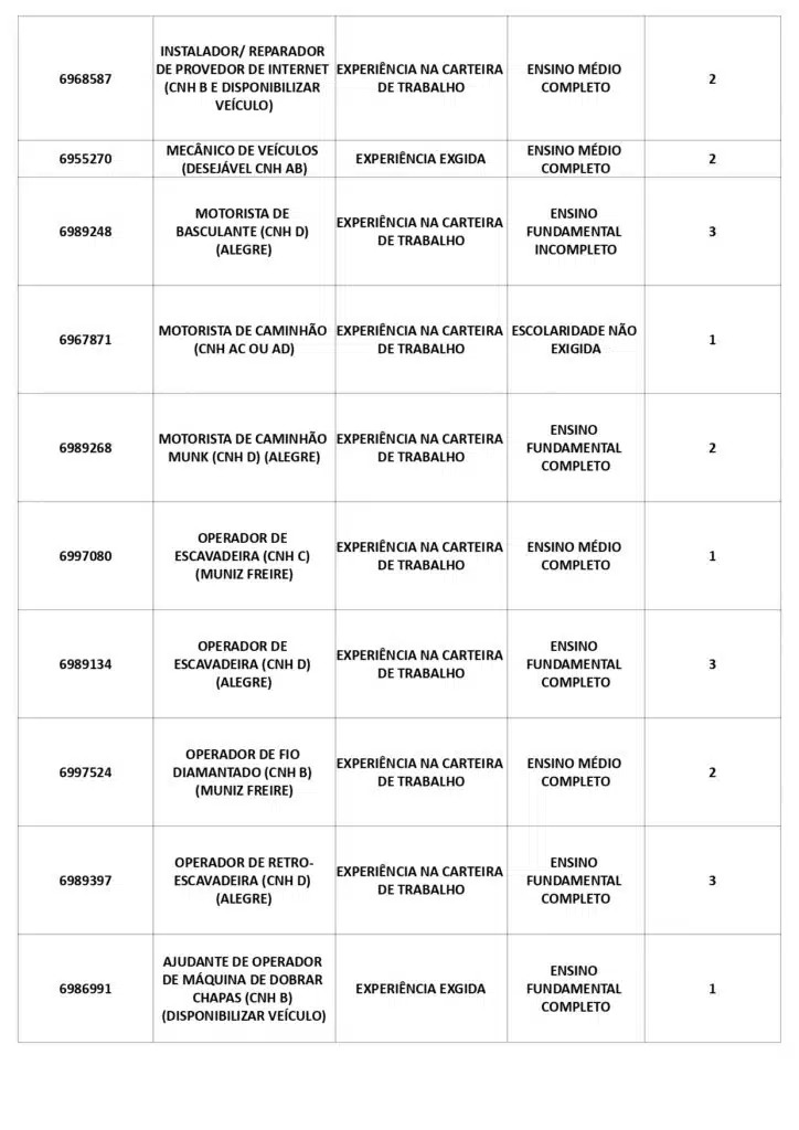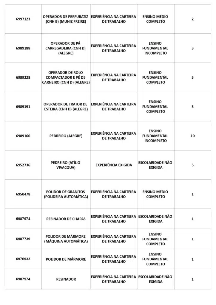 As oportunidades de emprego são para diversos cargos e níveis de escolaridade e para cidades do Sul do ES