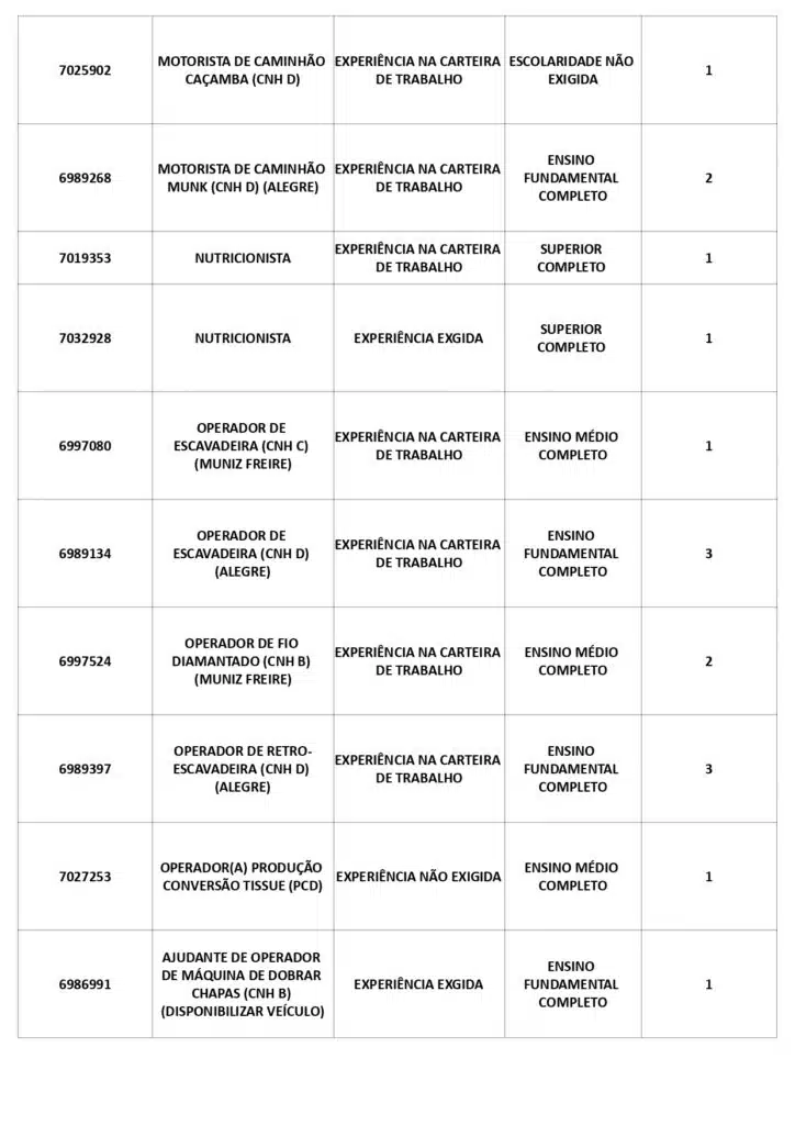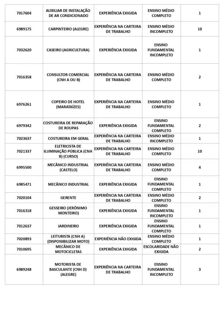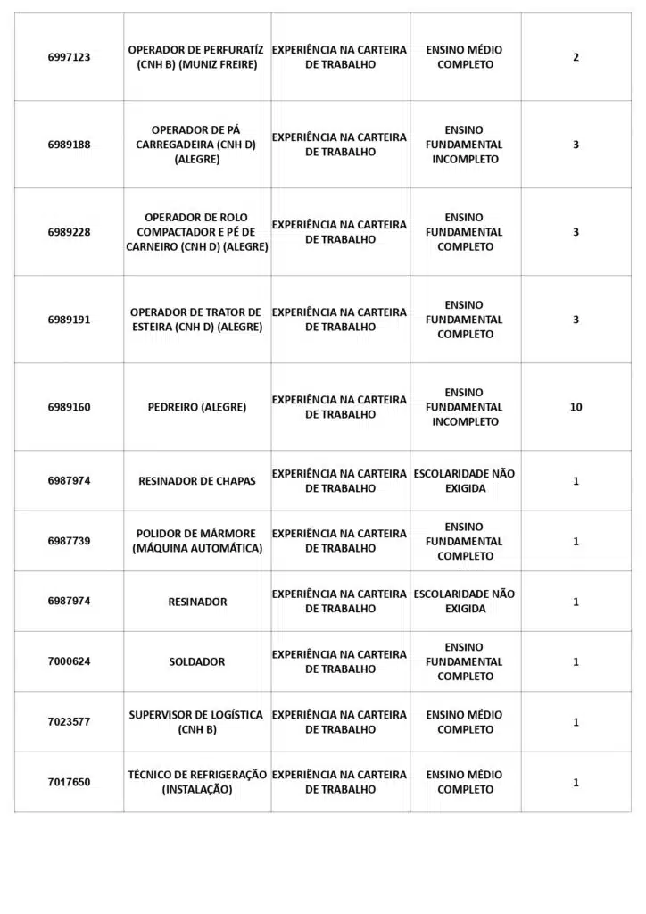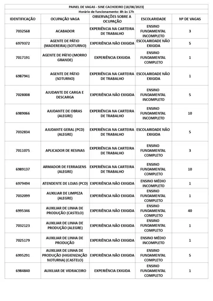 As oportunidades de emprego são para diversos cargos e níveis de escolaridade e para cidades do Sul do ES. No entanto, é preciso fazer um cadastro no Sine Cachoeiro para concorrê-las.