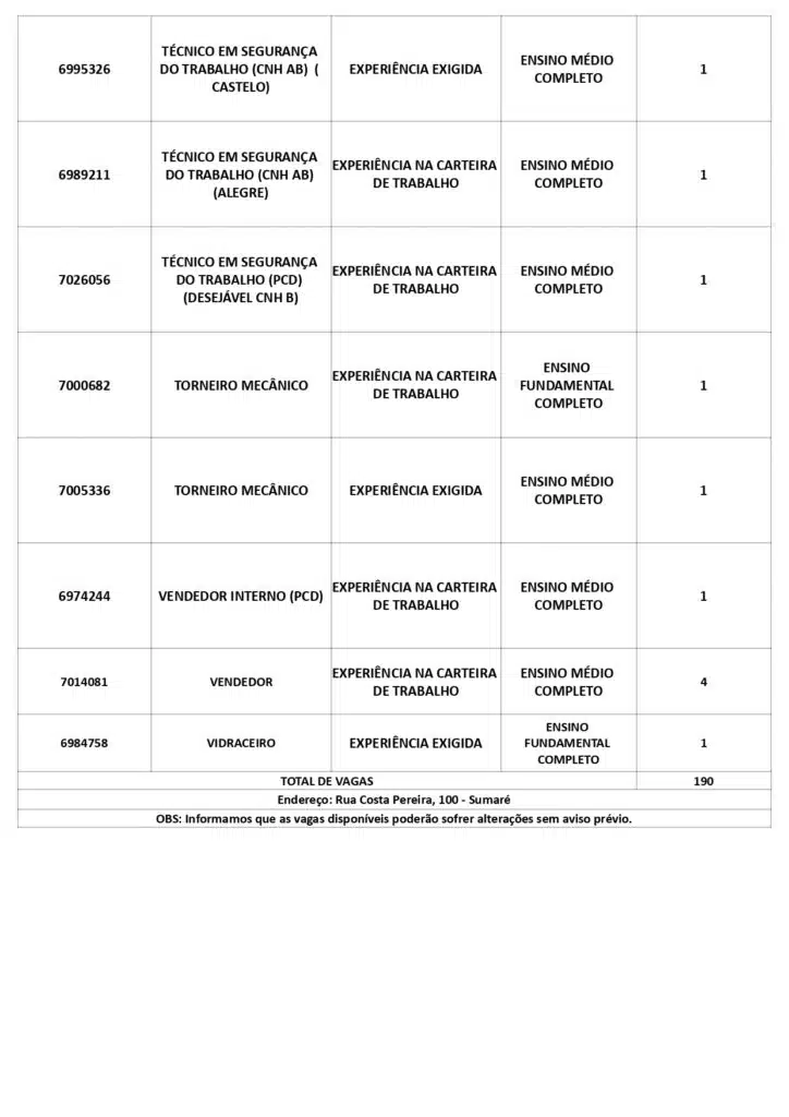 As oportunidades de emprego são para diversos cargos e níveis de escolaridade