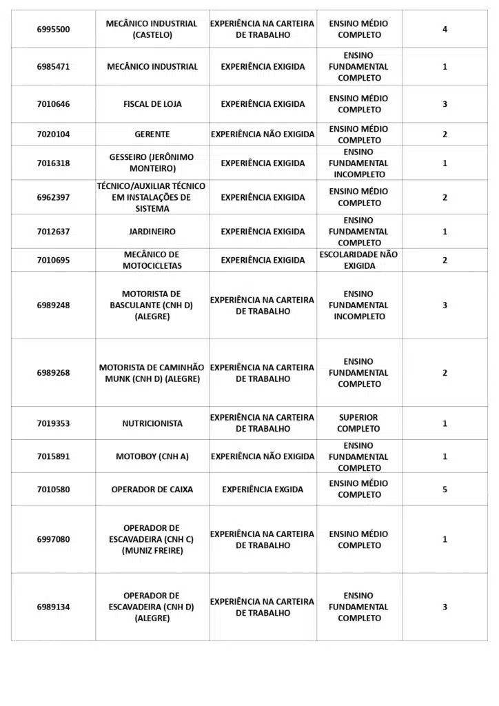 As oportunidades de emprego são para diversos cargos e níveis de escolaridade e para cidades do Sul do ES. No entanto, é preciso fazer um cadastro no Sine Cachoeiro para concorrê-las.
