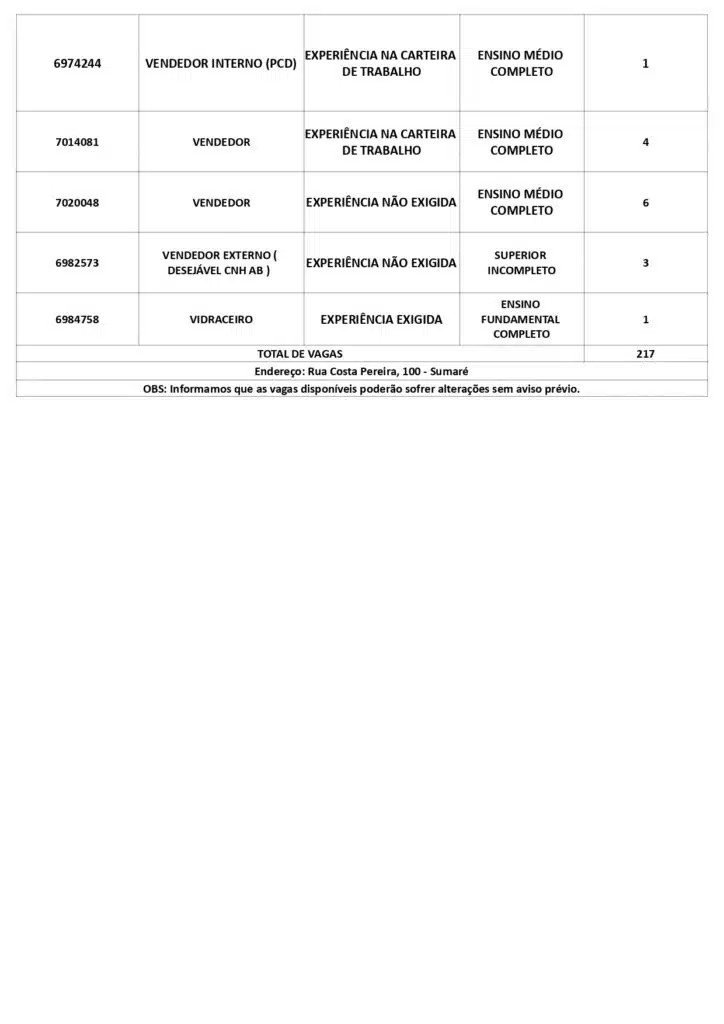 As oportunidades de emprego são para diversos cargos e níveis de escolaridade