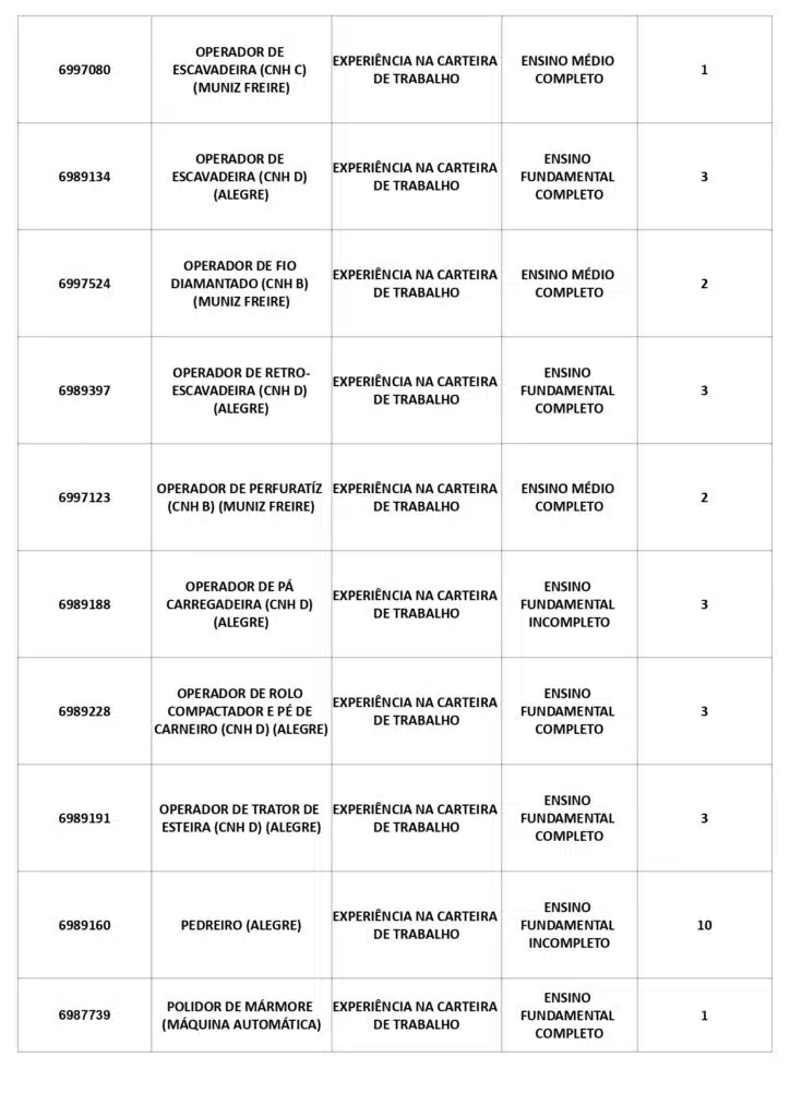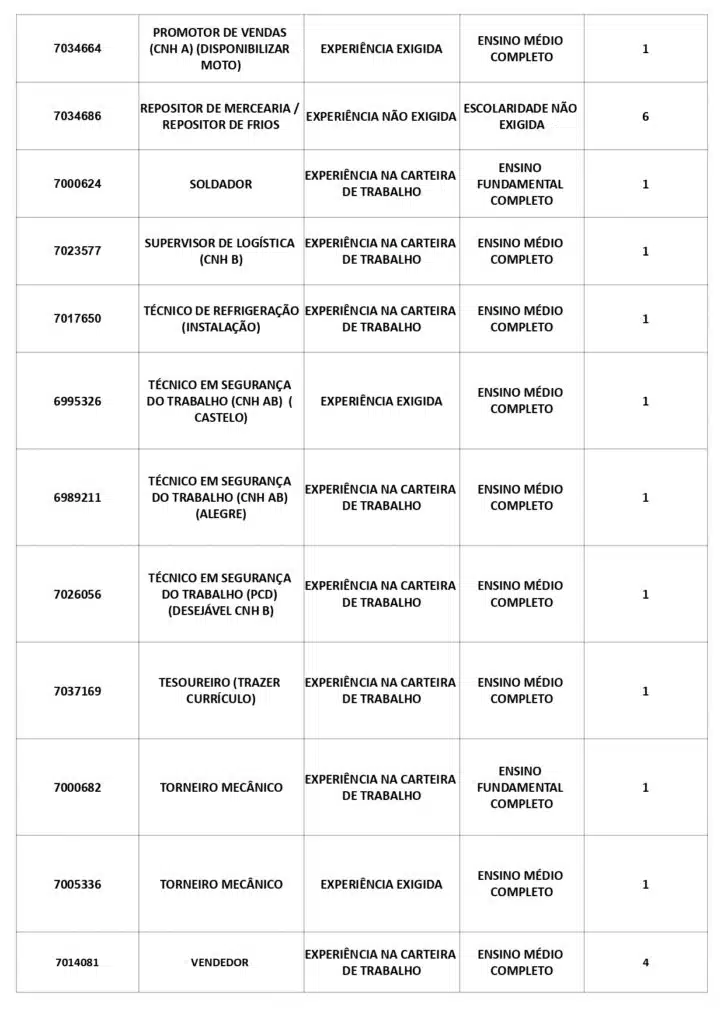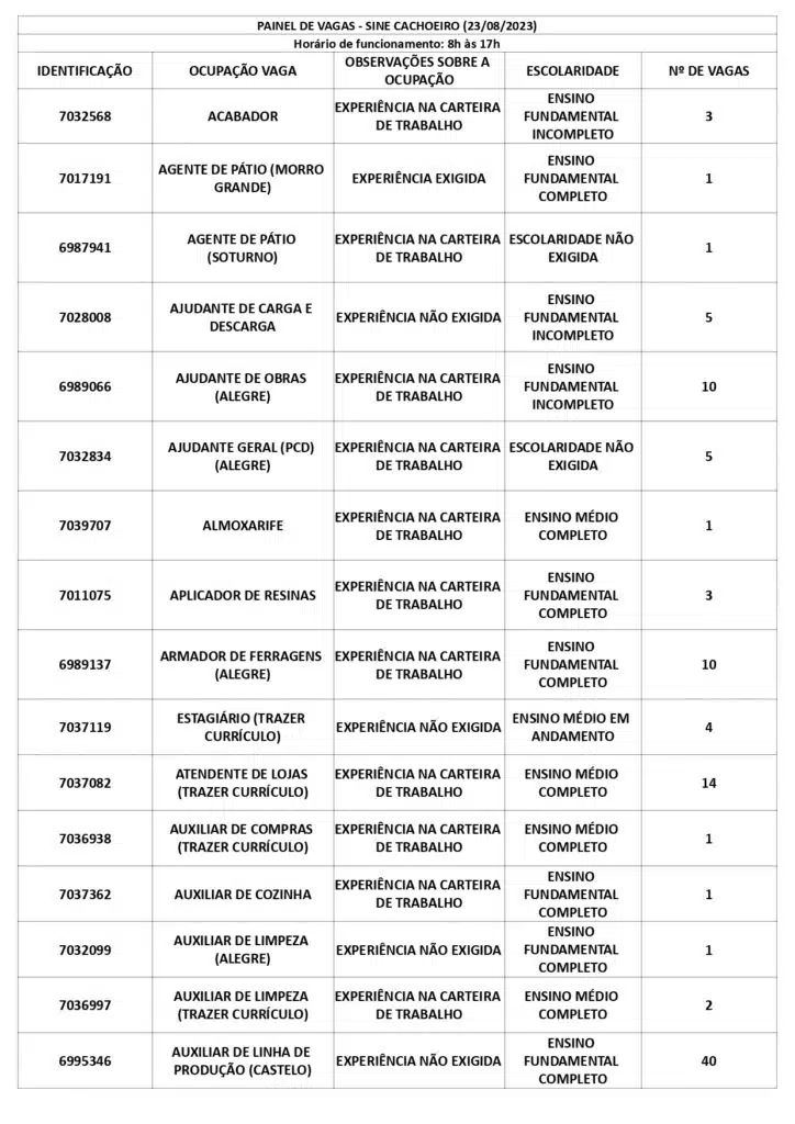 Receba as principais notícias no seu WhatsApp! clique aquiAs oportunidades de emprego são para diversos cargos e níveis de escolaridade e para cidades do Sul do ES. No entanto, é preciso fazer um cadastro no Sine Cachoeiro para concorrê-las.
