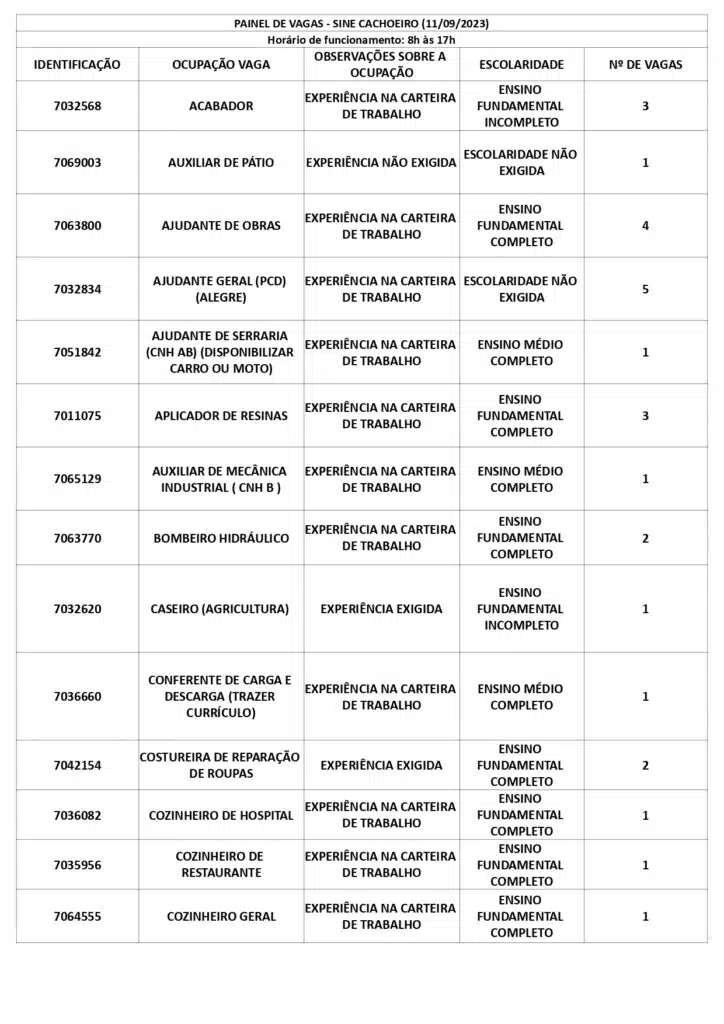 Receba as principais notícias no seu WhatsApp! clique aquiAs oportunidades de emprego são para diversos cargos e níveis de escolaridade e para cidades do Sul do ES. No entanto, é preciso fazer um cadastro no Sine Cachoeiro para concorrê-las.